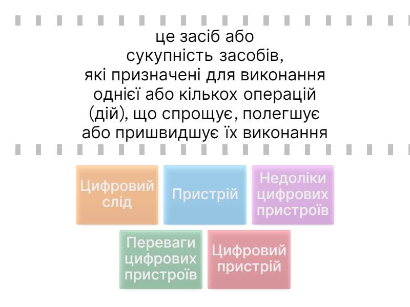 Пристрій - це засіб або сукупність засобів, які призначені для виконання однієї або кількох операцій (дій), що спрощує, полегшує або пришвидшує їх виконання, Цифровий пристрій - це пристрій, який здійснює один або кілька інформаційних процесів: передавання, зберігання та/або опрацювання повідомлень., Цифровий слід - всі дані, які користувач залишає в інтернеті., Переваги цифрових пристроїв - можливість точної обробки та зберігання інформації, швидку передачу даних, зручність в управлінні та широкі можливості для розваг та освіти, Недоліки цифрових пристроїв - вища вартість, складність конструкції, підвищене енергоспоживання та потенційні проблеми з безпекою даних,