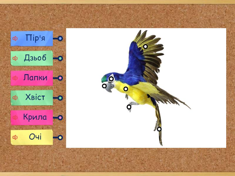 Дзьоб, Крила, Пір'я, Очі, Хвіст, Лапки.