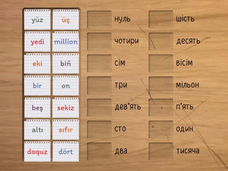 bir - один, eki - два, üç - три, dört - чотири, beş - п'ять, altı - шість, yedi - сім, sekiz - вісім, doquz - дев'ять, on - десять, yüz - сто, biñ - тисяча, million - мільон, sıfır - нуль,