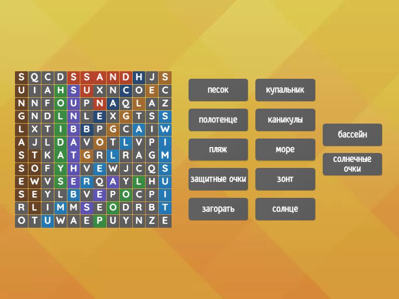 holidays - каникулы, sea - море, sun - солнце, umbrella - зонт, sunglasses - солнечные очки, beach - пляж, goggles - защитные очки, pool - бассейн, sunbathe - загорать, sand - песок, swimsuit - купальник, towel - полотенце,