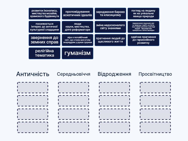 Античність: погляд на людину як на унікальне явище природи, перенесення людських рис на природу і навіть на богів, яких греки уявляли у вигляді людей – безсмертних, прекрасних і вічно молодих, одвічне прагнення до гармонійного розвитку, Середньовіччя: розвиток іконопису, мистецтва мозаїки, храмового будівництв, проповідування аскетичних ідеалів, віра в потойбічний світ, що стала могутнім знаряддям у руках церкви, релігійна тематика, Відродження: звернення до земних справ, прагнення людей до щасливого життя, посилюється інтерес до античної культурної спадщини, гуманізм, Просвітництво: зародження бароко та класицизму, зміна недосконалого світу знаннями, люди науки, мистецтва, діячі-реформатори,