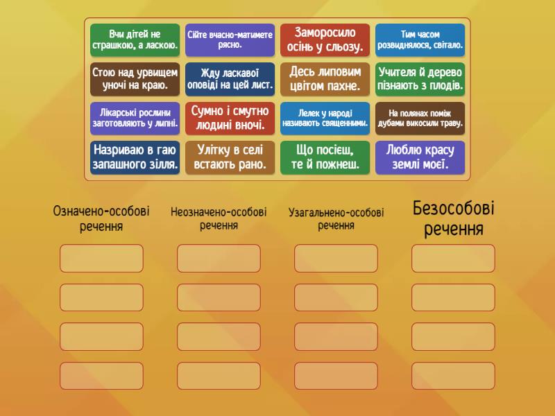Означено-особові речення: Стою над урвищем уночі на краю., Жду ласкавої оповіді на цей лист., Назриваю в гаю запашного зілля., Люблю красу землі моєї., Неозначено-особові речення: Лелек у народі називають священними., На полянах поміж дубами викосили траву., Улітку в селі встають рано., Лікарські рослини заготовляють у липні., Узагальнено-особові речення: Сійте вчасно-матимете рясно., Вчи дітей не страшкою, а ласкою., Учителя й дерево пізнають з плодів., Що посієш, те й пожнеш., Безособові речення: Тим часом розвиднялося, світало., Сумно і смутно людині вночі., Заморосило осінь у сльозу., Десь липовим цвітом пахне.,