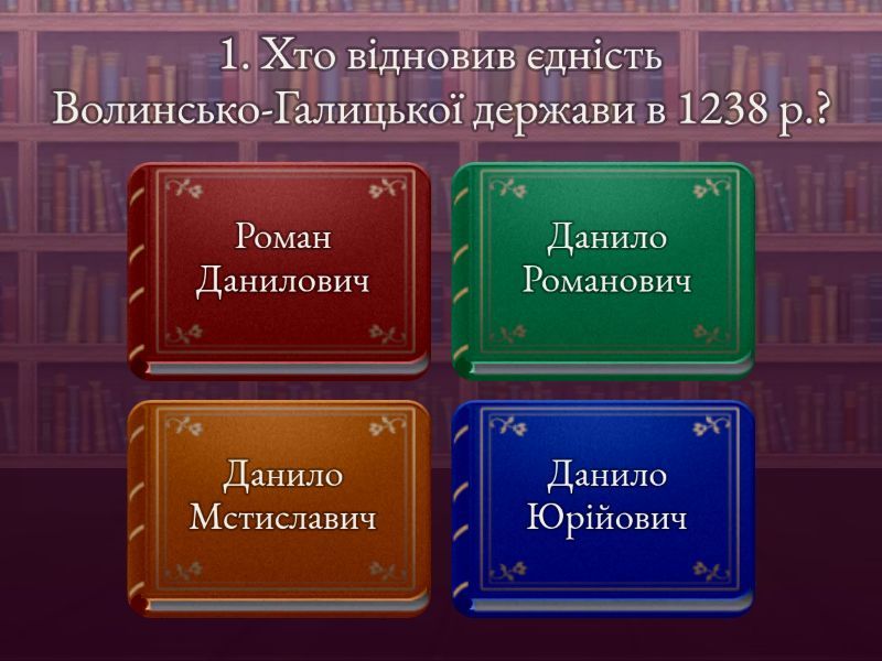 1) 1. Хто відновив єдність Волинсько-Галицької держави в 1238 р.? a) Роман Данилович b) Данило Романович c) Данило Мстиславич d) Данило Юрійович 2) 2. З ким Данило Романович правив у згоді? a) A) З батьком Романом Мстиславичем b) B) З братом Васильком c) C) З боярами d) D) З Папою Римським 3) 3. Яку подію здійснив Данило Романович у 1238 р.? a) A) Підкорив Київ b) B) Розгромив тевтонських лицарів під Дорогочином c) C) Коронувався у Дорогочині d) D) Відвідав Золоту Орду 4) 4. У якому році Данило Романович підпорядкував Київ? a) A) 1238 р. b) B) 1239 р. c) C) 1245 р. d) D) 1253 р. 5) 5. Який результат бою під Ярославом у 1245 р.? a) A) Поразка Данила Романовича b) B) Розгром угорсько-польських військ і зміцнення князівської влади c) C) Коронація Данила d) D) Похід до Золотої Орди 6) 6. Для чого Данило Романович коронувався у 1253 р.? a) A) Щоб відзначити перемогу над тевтонцями b) B) Щоб отримати допомогу від Папи Римського c) C) Щоб підтвердити владу над Києвом d) D) Щоб перенести столицю до Холма 7) 7. Куди Данило Романович переніс столицю? a) A) До Києва, яке укріпив b) B) До Дорогочина, де коронувався c) C) До Холма, який сам побудував d) D) До Львова, який зруйнував