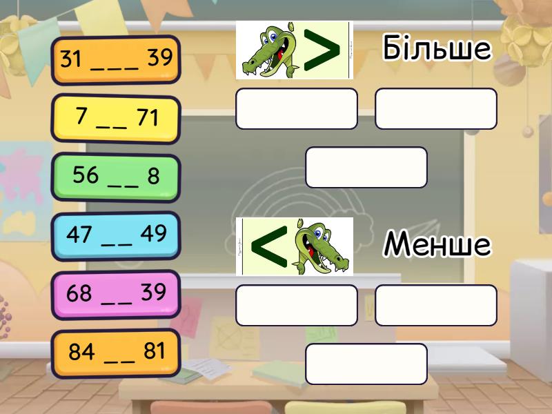 Більше: 68 __ 39 , 56 __ 8 , 84 __ 81 , Менше: 7 __ 71, 47 __ 49, 31 ___ 39 ,