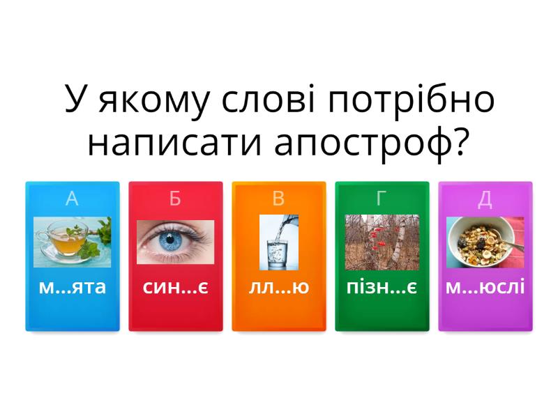 1) У якому слові потрібно написати апостроф?  a) м...ята b) син...є c) лл...ю d) пізн...є e) м...юслі 2) Яке слово написане з помилкою? a) з'їжджати b) роз'єднати c) під'обідати d) з'їсти 3) У якому слові слід поставити апостроф після р? a) повітр....яний b) сузір...я c) р...кзак d) р...ядок 4) Яке з імен напишеш без апострофа? a) Св...ятослав b) Лук...ян c) Мар...яна d) В...ячеслав 5) Усі слова пишуться без апострофа, крім... a) цв...ях b) моркв...яний c) духм...яний d) торф...яний 6) Апостроф пишеться у всіх слова, крім a) любов...ю b) мавп...ячий c) безхмар...я d) дерев...яний