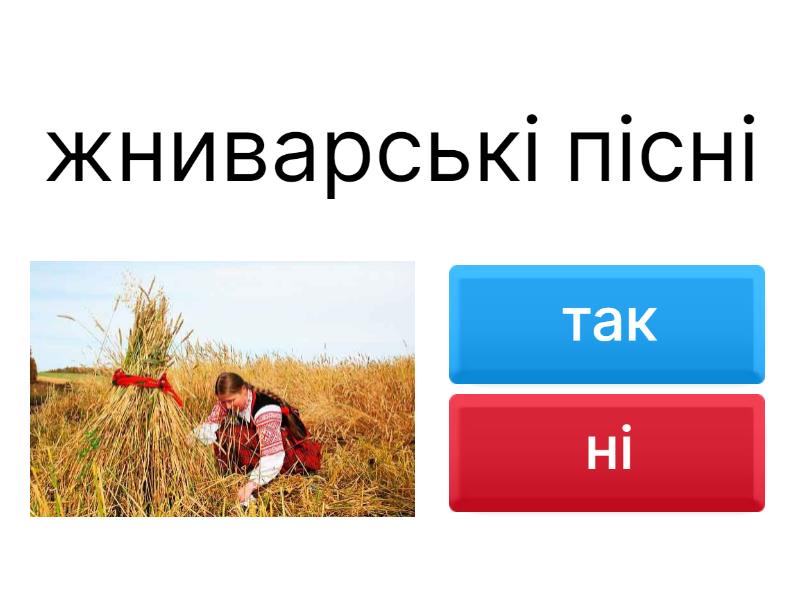 1) жниварські пісні a) так b) ні 2) веснянки a) так b) ні 3) купальські пісні a) так b) ні 4) колядки a) ні b) так 5) колядки a) так b) ні 6) веснянки a) ні b) так 7) жниварські пісні a) ні b) так 8) жниварські пісні a) ні b) так 9) купальські пісні a) ні b) так
