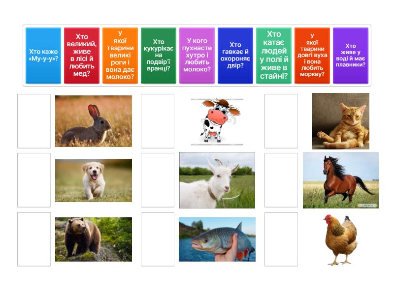 У якої тварини великі роги і вона дає молоко?, Хто каже «Му-у-у»?, У якої тварини довгі вуха і вона любить моркву?, Хто живе у воді й має плавники?, У кого пухнасте хутро і любить молоко?, Хто гавкає й охороняє двір?, Хто великий, живе в лісі й любить мед?, Хто кукурікає на подвір’ї вранці?, Хто катає людей у полі й живе в стайні?,