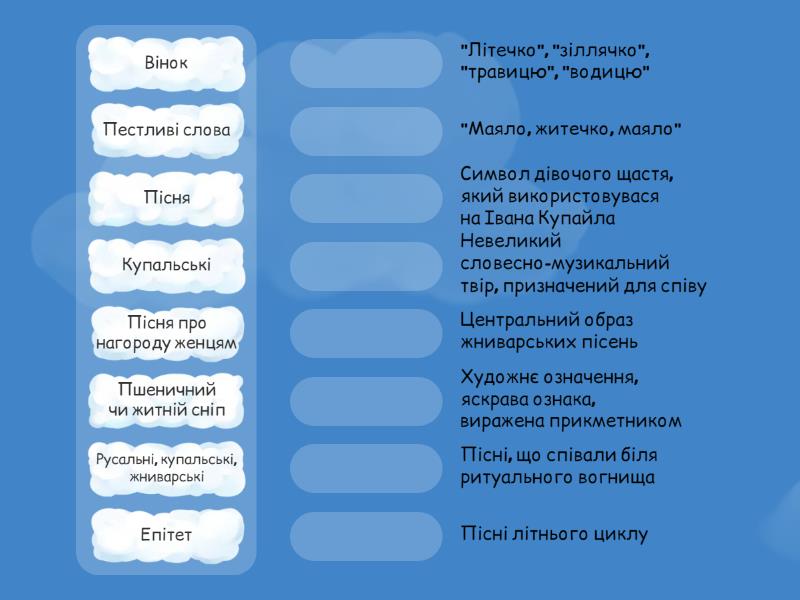 Пісня - Невеликий словесно-музикальний твір, призначений для співу, Календарно-обрядові пісні - Фольклорні твори, які виконувалися під час народних свят і обрядів, Зелені свята. Трійця - На які свята виконувались русальні пісні?, Купальські - Пісні, що співали біля ритуального вогнища, Вінок - Символ дівочого щастя, який використовувася на Івана Купайла, Купальська пісня - Ой пущу віночок на биструю воду, Жниварські пісні - Обрядові пісні, які звеличують процес збирання врожаю, прославляють працю хлібороба, Дідух - Сніп, що був останнім на обжинки, який залишали до Різдва у кутку хати, Анафора - Єдинопочаток, повторення однакових слів або речень на початку віршових рядків або строф, Пісня про нагороду женцям - "Маяло, житечко, маяло", Епітет - Художнє означення, яскрава ознака, виражена прикметником, Русальна пісня - "Ой біжить, біжить мала дівчина", Русальні, купальські, жниварські - Пісні літнього циклу, Пшеничний чи житній сніп - Центральний образ жниварських пісень, Символ дівочої вроди - Калина, Пестливі слова - "Літечко", "зіллячко", "травицю", "водицю",