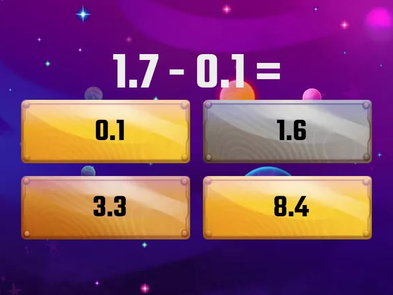 1) 1.7 - 0.1 = a) 0.1 b) 1.6 c) 3.3 d) 8.4 2) 7.7 - 0.5 = a) 1.2 b) 6.5 c) 7.2 d) 8.5 3) 6.4 - 0.2 = a) 5.1 b) 6.2 c) 6.3 d) 6.8 4) 2.1 - 0 = a) 2 b) 2.1 c) 2.4 d) 3.6 5) 5 - 0.2 = a) 3.4 b) 4.8 c) 5.5 d) 7.4 6) 4.7 - 0.3 = a) 4.4 b) 5.8 c) 8 d) 8.1 7) 8.3 - 0.4 = a) 4 b) 4.2 c) 7.9 d) 8.7 8) 0.9 - 0 = a) 0.9 b) 3.2 c) 7 d) 8.8 9) 1.4 - 0 = a) 1.4 b) 2.9 c) 3.8 d) 9.2 10) 5.4 - 0.5 = a) 1.8 b) 4.9 c) 9.3 d) 9.8 11) 6.9 - 0 = a) 3.1 b) 4.3 c) 6.9 d) 7.5 12) 0.3 - 0 = a) 0.3 b) 1.5 c) 5.2 d) 7.2 13) 6.7 - 0.4 = a) 2.2 b) 6.1 c) 6.2 d) 6.3 14) 7.9 - 0.2 = a) 4.1 b) 4.9 c) 7.7 d) 9 15) 1.1 - 0 = a) 1 b) 1.1 c) 2.6 d) 8.9 16) 1.6 - 0.1 = a) 0 b) 1.5 c) 3.9 d) 7.8 17) 7.1 - 0 = a) 4.6 b) 5.3 c) 7.1 d) 10 18) 2.5 - 0 = a) 2.5 b) 3.7 c) 4.4 d) 5.7 19) 3.5 - 0.2 = a) 2.3 b) 2.8 c) 3.3 d) 9.1 20) 6 - 0.1 = a) 4.5 b) 5.9 c) 7.6 d) 8.2