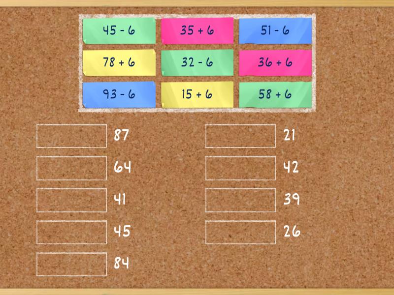 15 + 6 - 21, 26 + 6 - 32, 48 + 6 - 54, 57 + 6 - 63, 79 + 6 - 85, 38 + 6 - 44, 29 + 6 - 35, 35 + 6 - 41, 78 + 6 - 84, 58 + 6 - 64, 36 + 6 - 42, 47 + 6 - 53, 33 - 6 - 27, 45 - 6 - 39, 84 - 6 - 78, 32 - 6 - 26, 51 - 6 - 45, 93 - 6 - 87,