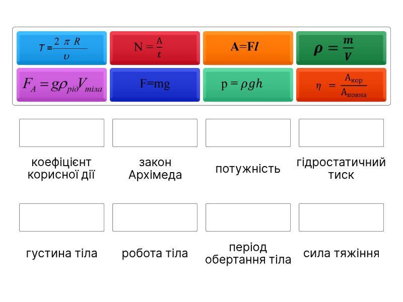 тиск твердих тіл, середня швидкість, густина тіла, закон Архімеда, сила тяжіння, сила пружності, гідростатичний тиск, потужність, потенціальна енергія, кінетична енергія, робота тіла, сила тертя, коефіцієнт корисної дії, момент сили, вага тіла, період обертання тіла,