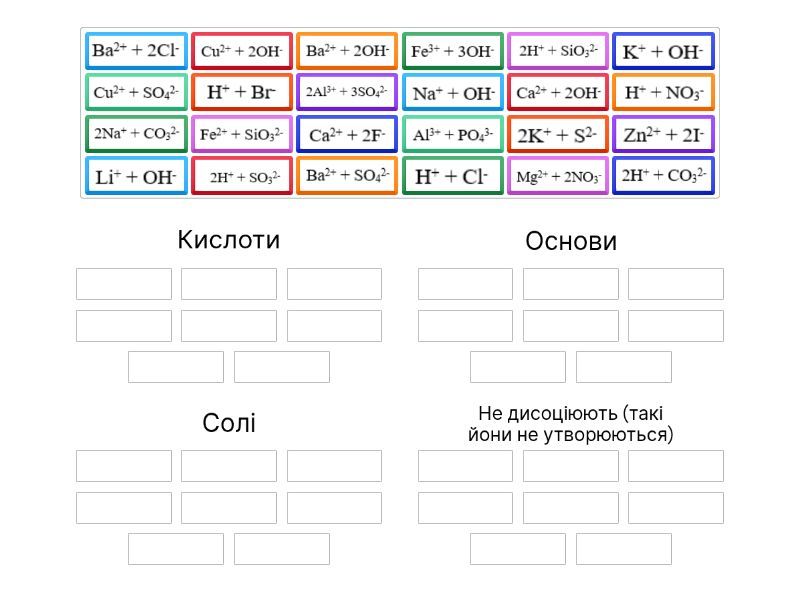 Кислоти: , , , , , Основи: , , , , Солі: , , , , , , , Не дисоціюють (такі йони не утворюються): , , , , , , , ,