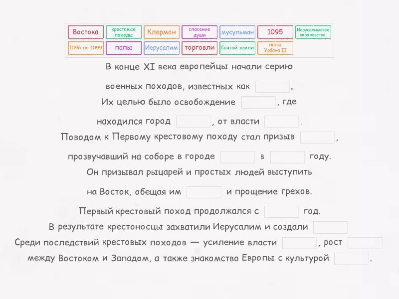 В конце XI века европейцы начали серию военных походов, известных как ____. Их целью было освобождение ____, где находился город ____, от власти ____. Поводом к Первому крестовому походу стал призыв ____, прозвучавший на соборе в городе ____ в ____ году. Он призывал рыцарей и простых людей выступить на Восток, обещая им ____ и прощение грехов. Первый крестовый поход продолжался с ____ год. В результате крестоносцы захватили Иерусалим и создали ____ Среди последствий крестовых походов — усиление власти ____, рост ____ между Востоком и Западом, а также знакомство Европы с культурой ____.