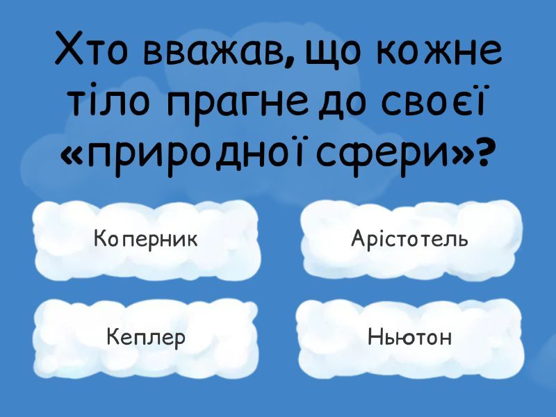 1) Хто вважав, що кожне тіло прагне до своєї «природної сфери»? a) Коперник b) Арістотель c) Кеплер d) Ньютон 2) Які предмети, за Арістотелем, падають донизу? a) Легкі b) Газоподібні c) Важкі d) Небесні 3) Хто запропонував геліоцентричну систему світу? a) Йоганн Кеплер b) Ісаак Ньютон c) Ніколай Коперник d) Альберт Ейнштейн 4) Які орбіти планет довів Кеплер? a) Еліптичні b) Кругові c) Спіральні d) Параболічні 5) У якому році Ньютон опублікував «Математичні начала натуральної філософії»? a) 1643 b) 1600 c) 1727 d) 1687 6) Як формулюється закон всесвітнього тяжіння Ньютона? a) Сила пропорційна швидкості руху b) Сила пропорційна квадрату відстані c) Сила пропорційна добутку мас і обернено пропорційна квадрату відстані d) Сила пропорційна об’єму тіл 7) Хто пояснював рух планет потоками ефіру? a) Картезіанці b) Коперник c) Ейнштейн d) Кеплер 8) Яка теорія пояснила прецесію орбіти Меркурія? a) Закон Ньютона b) Теорія вихорів c) Загальна теорія відносності d) Геліоцентрична система 9) Хто створив загальну теорію відносності? a) Ісаак Ньютон b) Арістотель c) Йоганн Кеплер   d) Альберт Ейнштейн 10) Що є сутністю гравітації за Ейнштейном? a) Сила тяжіння b) Викривлення простору-часу c) Потоки ефіру d) Енергія руху 11) Яка з фундаментальних взаємодій є найслабшою? a) Електромагнітна b) Гравітаційна c) Сильна ядерна d) Слабка ядерна 12) Яка сучасна наукова проблема пов’язана з гравітацією? a) Вивчення сонячних плям b) Пошук квантової теорії гравітації c) Дослідження магнітних полів Землі d) Відкриття нових планет