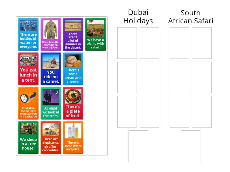 Dubai Holidays: You ride on a camel., There aren't a lot of animals in the desert., You eat lunch in a tent., There's some bread and cheese., There's a plate of fruit., There are bottles of water for everyone., South African Safari: We sleep in a tree house., It's dark in the morning so put a torch in a backpack!, There are elephants, giraffes, crocodiles., There is some water and juice., We have a picnic with salad., It's cold in the morning so wear a jacket!, At night we look at the stars.,
