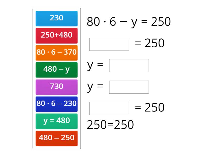 80 · 6 – y = 250 ____ = 250 y = ____ y = ____ ____ = 250 250=250 (x – 198) · 90 = 2 700 ____ = ____ x – 198 = ____ x = ____ ____ (228 – 198)·90 = 2 700 2 700 = 2 700