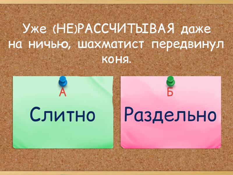 1) Уже (НЕ)РАССЧИТЫВАЯ даже на ничью, шахматист передвинул  коня. a) Слитно b) Раздельно 2) Андрей, (НЕ)ДОУМЕВАЯ, вертел пакет в руках. a) Слитно b) Раздельно 3) Оршанский (НЕ)ДОЕДАЛ, одевался весьма скромно, а все деньги за частную практику отправлял  семье a) Слитно b) Раздельно 4) Ничем (НЕ)ИНТЕРЕСУЯСЬ, Наталья равнодушно смотрела на чернеющее небо, на бушующий океан. a) Слитно b) Раздельно 5) Мальчик (НЕ)СПЕША взял рюкзак и отправился на урок. a) Слитно b) Раздельно 6) Я не любитель романтических комедий и лёгких мелодрам, поэтому фильм я так и (НЕ)ДОСМОТРЕЛ до конца. a) Слитно b) Раздельно 7) Именно критики у нас и (НЕ)ДОСТАЁТ. a) Слитно b) Раздельно 8) Мать работала (НЕ)ПОКЛАДАЯ рук, сыновья и дочери старались помогать ей во всём. a) Слитно b) Раздельно 9) Мать видела, что её сын что-то (НЕ)ДОГОВАРИВАЕТ, но решила не давить на него и подождать: возможно, он сам решит всё ей рассказать. a) Слитно b) Раздельно 10) Я так и (НЕ)ДОГОВОРИЛ, потому что меня снова перебила Иришка. a) Слитно b) Раздельно 11) Дальше он спрятал рукопись, боясь, что начнётся шум, а тогда ему (НЕ)СДОБРОВАТЬ. a) Слитно b) Раздельно