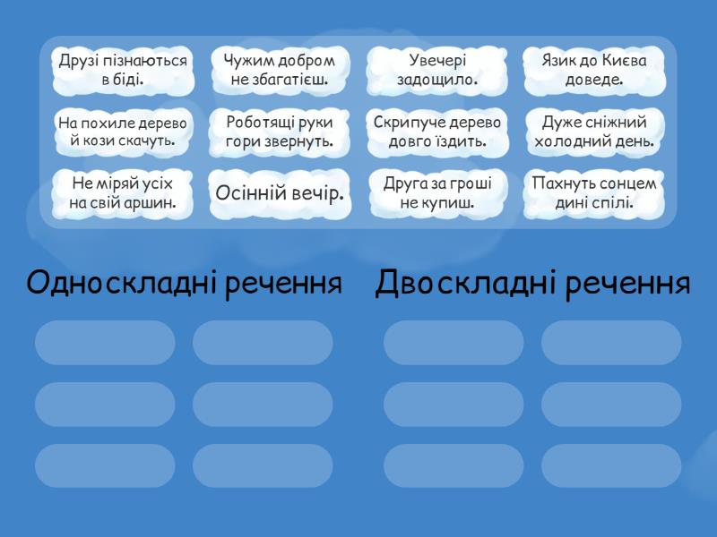 Односкладні речення: Чужим добром не збагатієш., Дуже сніжний холодний день., Не міряй усіх на свій аршин., Друга за гроші не купиш., Осінній вечір., Увечері задощило., Двоскладні речення: Роботящі руки гори звернуть., Язик до Києва доведе., На похиле дерево й кози скачуть., Скрипуче дерево довго їздить., Пахнуть сонцем дині спілі., Друзі пізнаються в біді.,