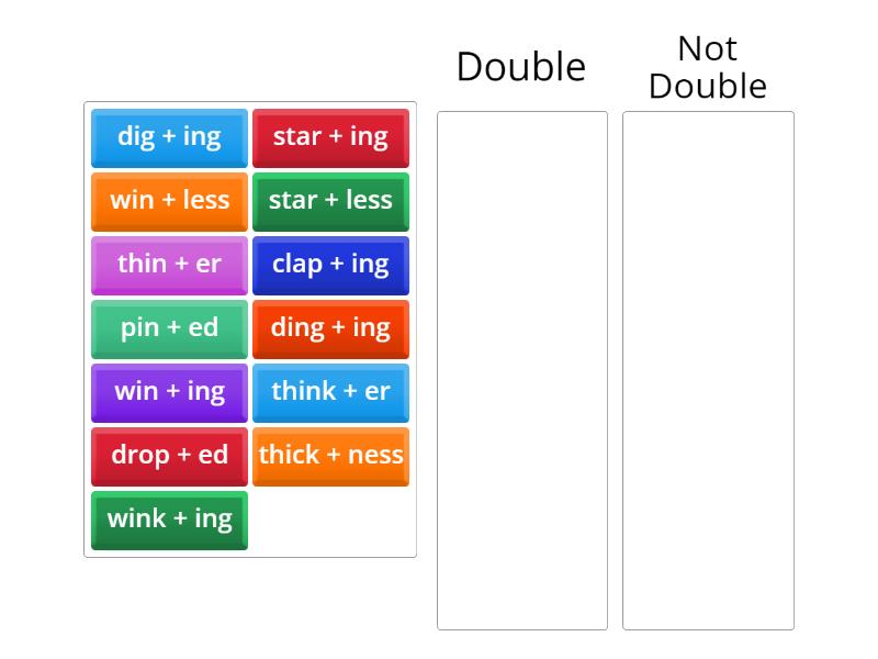 Double : thin + er, clap + ing, star + ing, drop + ed, dig + ing, pin + ed, win + ing, Not Double: think + er, thick + ness, star + less, ding + ing, wink + ing, win + less,