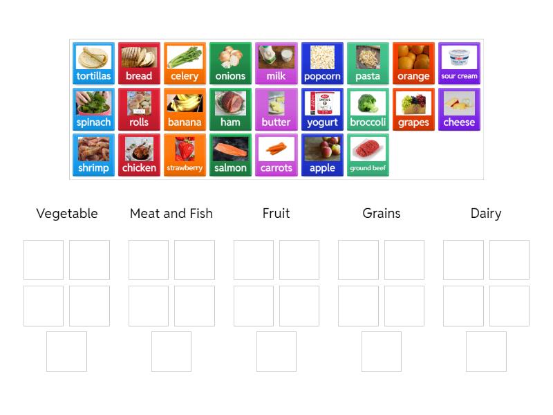 Vegetable: broccoli, spinach, carrots, celery, onions, Meat and Fish: chicken, shrimp, ground beef, ham, salmon, Fruit: banana, grapes, apple, orange, strawberry, Grains: pasta, bread, popcorn, tortillas, rolls, Dairy: milk, butter, yogurt, cheese, sour cream,