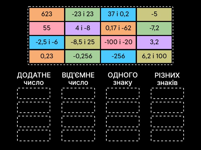ДОДАТНЕ число: 0,23, 55, 3,2, 623, ВІД'ЄМНЕ число: -5, -7,2, -256, -0,256, ОДНОГО знаку: 37 і 0,2, -2,5 і -6, 6,2 і 100, -100 і -20, РІЗНИХ знаків: 4 і -8, -23 і 23, -8,5 і 25, 0,17 і -62,