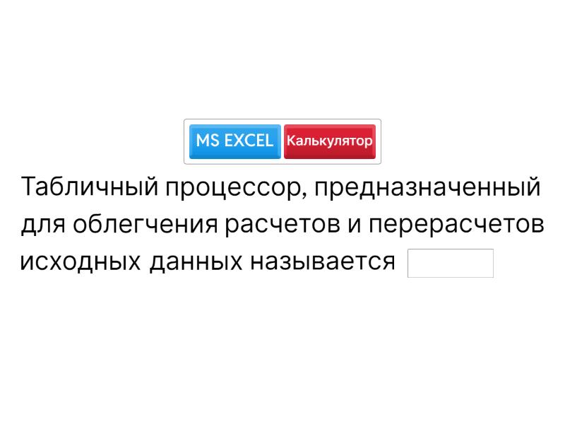 Табличный процессор, предназначенный для облегчения расчетов и перерасчетов исходных данных называется ____ Ввод формулы в MS Excel начинается со знака ____ Каждая ячейка имеет адрес, состоящий ____ для вычисления процента от числа необходимо ____ Прямоугольная область, охватывающая сразу несколько строк и/или столбцов ____
