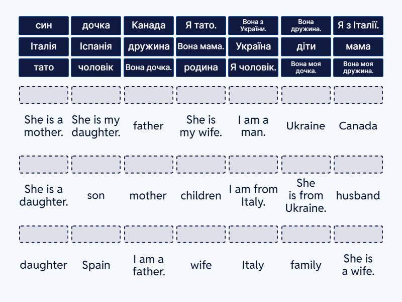 Україна - Ukraine, Канада - Canada, Італія - Italy, Іспанія - Spain, Вона з України. - She is from Ukraine., Я з Італії. - I am from Italy., родина - family, мама - mother, тато - father, діти - children, син - son, дочка - daughter, чоловік - husband, дружина - wife, Я тато. - I am a father., Вона мама. - She is a mother., Вона дочка. - She is a daughter., Я чоловік. - I am a man., Вона дружина. - She is a wife., Вона моя дружина. - She is my wife., Вона моя дочка. - She is my daughter.,