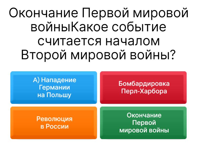 1) Окончание Первой мировой войныКакое событие считается началом Второй мировой войны? a) A) Нападение Германии на Польшу b) Бомбардировка Перл-Харбора c) Революция в России d) Окончание Первой мировой войны 2) Какое событие положило конец Второй мировой войне? a) Нападение на Польшу b) Капитуляция Германии и Японии 3) Какое событие стало причиной начала Холодной войны? a) Раздел Германии и создание НАТО b) Великая депрессия 4) Какое событие положило конец Римской империи? a) Падение Константинополя b) Захват Рима варварами в 476 году 5) Какое событие ознаменовало начало Великой французской революции? a) Провозглашение Наполеона императором b) Взятие Бастилии 6) Вопрос: Какое событие ознаменовало начало Первой мировой войны? a) 3. Убийство эрцгерцога Франца Фердинанда b) Нападение Германии на Францию 7) Какое событие считается началом Холодной войны? a) Создание ООН b) Речь Черчилля в Фултоне 8) Вопрос: Какое событие положило конец феодальному строю в Японии? a) Реформы Мэйдзи b) Война с США 9) Какое событие привело к началу Русской революции 1917 года? a) Кровавое воскресенье 1905 года b) Начало Первой мировой войны 10) Вопрос: Какое событие привело к созданию Соединённых Штатов Америки? a) 1. Война за независимость b) Гражданская война