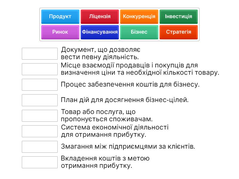 Конкуренція - Змагання між підприємцями за клієнтів., Бізнес - Система економічної діяльності для отримання прибутку., Продукт - Товар або послуга, що пропонується споживачам., Ліцензія - Документ, що дозволяє вести певну діяльність., Інвестиція - Вкладення коштів з метою отримання прибутку., Ринок - Місце взаємодії продавців і покупців для визначення ціни та необхідної кількості товару., Стратегія - План дій для досягнення бізнес-цілей., Фінансування - Процес забезпечення коштів для бізнесу.,