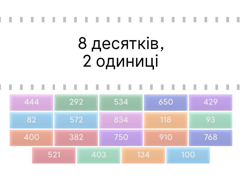 82 - 8 десятків, 2 одиниці, 382 - 3 сотні, 8 десятків, 2 одиниці , 134 - 1 сотня, 3 десятки, 4 одиниці, 534 - 5 сотень, 3 десятки, 4 одиниці, 834 - 8 сотень, 3 десятки, 4 одиниці, 650 - 6 сотень і 5 десятків, 403 - 4 сотні і 3 одиниці, 400 - 4 сотні, 750 - 7 сотень, 5 десятків, 572 - 5 сотень, 7 десятків, 2 одиниці, 521 - 5 сотень, 2 десятки, 1 одиниця, 118 - 1 сотня, 1 десяток, 8 одиниць, 292 - 2 сотня, 9 десятків, 2 одиниці, 444 - 4 сотні, 4 десятки, 4 одиниці, 768 - 7 сотень, 6 десятків, 8 одиниць, 93 - 9 десятків, 3 одиниці, 910 - 9 сотень, 1 десяток, 429 - 4 сотні, 2 десятки, 9 одиниць, 100 - 10 десятків,