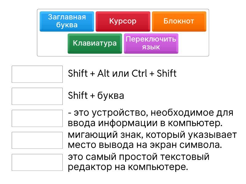 Клавиатура - - это устройство, необходимое для ввода информации в компьютер., Курсор - мигающий знак, который указывает место вывода на экран символа., Блокнот - это самый простой текстовый редактор на компьютере., Переключить язык - Shift + Alt или Ctrl + Shift, Заглавная буква - Shift + буква,