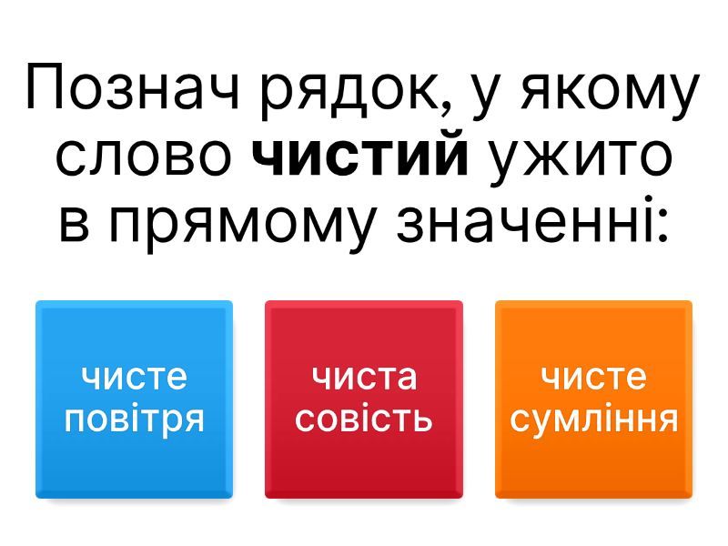 1) Познач рядок, у якому слово чистий ужито в прямому значенні: a) чисте повітря b) чиста совість c) чисте сумління 2) Познач рядок, у якому всі слова однозначні: a) смуга, гілка, твердий, мишка b) зерно, коса, вікно, хвиля c) береза, бузок, Карпати, батист 3) У якому рядку виділене слово вжито в переносному значенні? a) Сміються діти безтурботно. b) Сміється сонце весело із неба. c) Він хвилювання він то сміявся, то плакав. 4) Слова-синоніми наведено в рядку: a) тихий, беззвучний, сонячний b) дивний, неймовіриний, великий c) розумний, недурний, мудрий 5) Антоніми вжито в реченні: a) Довго не свари, бо хвалити не буде коли. b) Теє слово всім давало то пораду, то розвагу. c) Сусідський собака не зрозумів моїх добрих намірів, моєї гуманної місії. 6) Омоніми використано в реченні: a) Дніпр клекоче, стогне, плаче й гриву сивую трясе. b) Через досвіду й сумління брак йде з фабрики суцільний брак. c) Уже весніє, уже весняний вітер віє. 7) Пароніми подано в рядку: a) ляси точити - теревені правити b) картопля-бараболя c) авторитетний - авторитарний 8) Познач рядок, у якому подані слова не є синонімами: a) моторний хлопець - прудкий хлопець b) білий костюм - білосніжний костюм c) піщана коса - заплетена коса 9) У реченні "Петрові ... сліпота" пропущено слово: a) погрожувала b) пригрожувала c) загрожувала