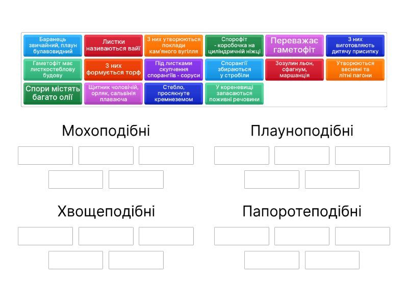 Мохоподібні: Переважає гаметофіт, Спорофіт - коробочка на циліндричній ніжці, Гаметофіт має листкостеблову будову, З них формується торф, Зозулин льон, сфагнум, маршанція, Плауноподібні: Спорангії збираються у стробіли, Спори містять багато олії, З них виготовляють дитячу присипку, Баранець звичайний, плаун булавовидний, Хвощеподібні: Стебло, просякнуте кремнеземом, Утворюються весняні та літні пагони, У кореневищі запасаються поживні речовини, Папоротеподібні: Листки називаються вайї, Під листками скупчення спорангіїв - соруси, З них утворюються поклади кам'яного вугілля, Щитник чоловічій, орляк, сальвінія плаваюча,