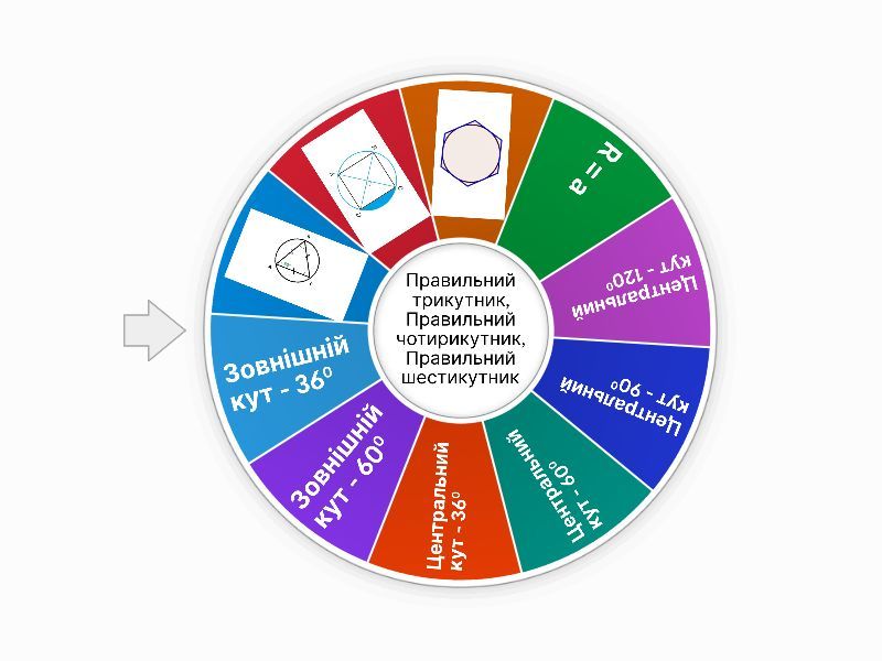 1) R = a a) Правильний трикутник b) Правильний шестикутник c) Правильний чотирикутник d) Правильний десятикутник 2) Центральний кут - 1200 a) Правильний трикутник b) Правильний шестикутник c) Правильний чотирикутник d) Правильний десятикутник 3) Центральний кут - 900 a) Правильний трикутник b) Правильний шестикутник c) Правильний чотирикутник d) Правильний десятикутник 4) Центральний кут - 600 a) Правильний трикутник b) Правильний шестикутник c) Правильний чотирикутник d) Правильний десятикутник 5) Центральний кут - 360 a) Правильний трикутник b) Правильний шестикутник c) Правильний чотирикутник d) Правильний десятикутник 6) Зовнішній кут - 600 a) Правильний трикутник b) Правильний шестикутник c) Правильний чотирикутник d) Правильний десятикутник 7) Зовнішній кут - 360 a) Правильний трикутник b) Правильний шестикутник c) Правильний чотирикутник d) Правильний десятикутник