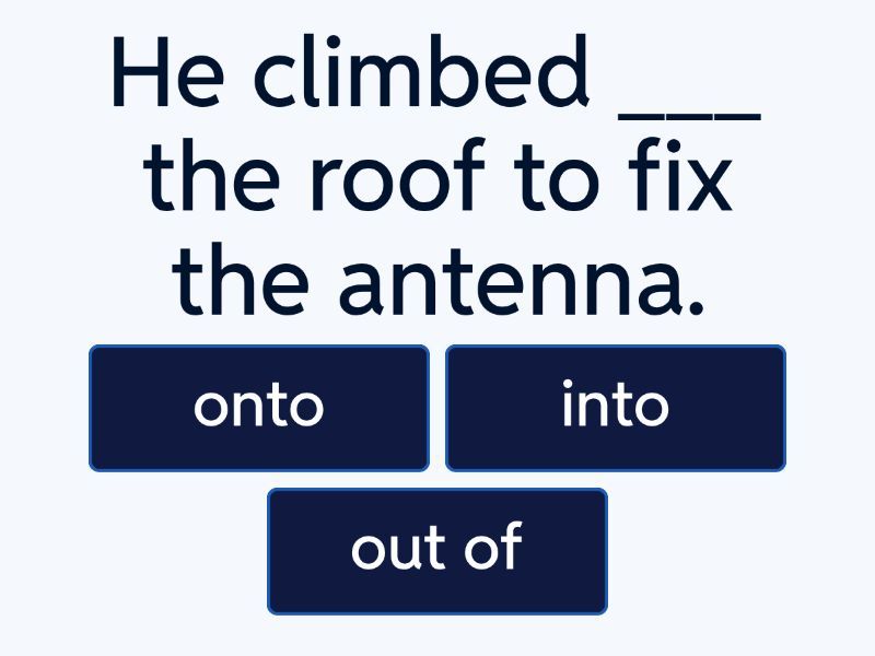 1) He climbed ___ the roof to fix the antenna. a) onto b) into c) out of 2) She walked ___ the school building to look for her friends. a) onto b) around c) obove 3) The kinds jumped ___ a swimming pool a) over b) outside c) into 4) He jumped ___ the car and ran home. a) obove b) into c) out of 5) The keys are ___ the box a) around b) inside c) onto 6) They are playing ___ in the garden because the weather is nice. a) outside b) over c) into 7) A bird flew ___ my head very quickly! a) inside b) over c) out of