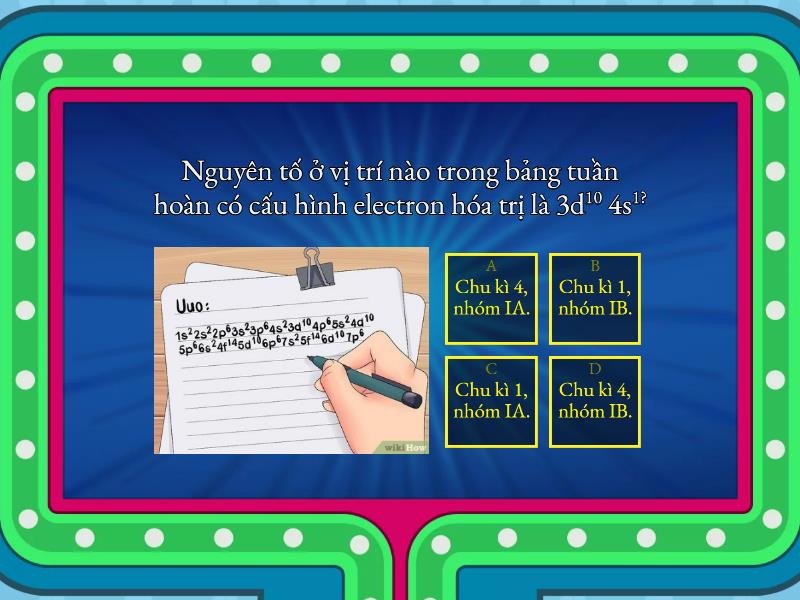 1) Có bao nhiêu nguyên tắc sắp xếp các nguyên tố trong bảng tuần hoàn hoá học? a) 2 nguyên tắc b) 3 nguyên tắc c) 4 nguyên tắc d) Không theo một nguyên tắc nào nhất định. 2) Đơn vị nhỏ nhất trong bảng tuần hoàn các nguyên tố hoá học là gì? a) Cột b) Hàng c) Bảng d) Ô 3) Các nguyên tố có cùng số lớp Electron được xếp vào 1 hàng. Vậy hàng đó được gọi là gì? a) Chu kì b) Bảng tuần hoàn c) Phân tử khối d) Nhóm nguyên tố 4) Số thứ tự của chu kì của nguyên tố bằng: a) Số electron hoá trị b) Số eletron c) Số lớp electron d) Số electron lớp ngoài cùng 5) Định nghĩa nhóm nguyên tố? a) Tập hợp các nguyên tố mà nguyên tử có cấu hình electron tương tự nhau, do đó có tính chất hóa học gần giống nhau và được sắp xếp thành một cột. b) Dãy các nguyên tố mà nguyên tử của chúng có cùng số lớp electron, được sắp xếp theo chiều điện tích hạt nhân tăng dần. c) Tập hợp các nguyên tố hoá học. d) Tập hợp những nguyên tử cùng loại, có cùng số proton trong hạt nhân. 6) Biết Z=20. Hãy cho biết vị trí của nguyên tố trong bảng tuần hoàn và dự đoán xem nguyên tố đó là kim loại hay phi kim? a) Ô số 19, chu kì 3, nhóm IIA và là phi kim. b) Ô số 20, chu kì 4, nhóm IVA và là kim loại. c) Ô số 20, chu kì 3, nhóm IIA và là phi kim. d) Ô số 20, chu kì 4, nhóm IIA và là kim loại. 7) Số 26,9815 trong ô sau có ý nghĩa gì? a) Số thứ tự của nguyên tố Nhôm trong bảng tuần hoàn. b) Nguyên tử khối trung bình của Nhôm. c) Độ âm điện của Nhôm. d) Cấu hình electron nguyên tử của Nhôm. 8) Số thứ tự của nguyên tố A là 17, cho biết nguyên tố A thuộc chu kì nào, nhóm nào? a) Chu kì 3, nhóm VA. b) Chu kì 4, nhóm VIIA. c) Chu kì 3, nhóm VIIA. d) Chu kì 5, nhóm IIIA. 9) Nguyên tử X có phân lớp electron ngoài cùng là 3p4. Hãy xác định câu sai trong các câu sau: a) X thuộc nhóm VIA. b) Hạt nhân của X có 16 nguyên tử. c) X thuộc chu kì 3. d) Lớp ngoài cùng của X có 6 electron. 10) Nguyên tố ở vị trí nào trong bảng tuần hoàn có cấu hình electron hóa trị là 3d10 4s1? a) Chu kì 4, nhóm IA. b) Chu kì 1, nhóm IB. c) Chu kì 1, nhóm IA. d) Chu kì 4, nhóm IB.