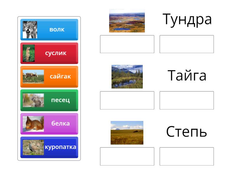 Тундра : песец, куропатка, Тайга: волк, белка, Степь: суслик, сайгак,