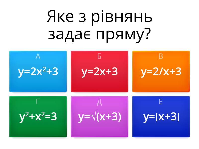 1) Яке з рівнянь задає пряму? a) у=2х2+3 b) у=2х+3 c) у=2/х+3 d) у2+х2=3 e) у=√(х+3) f) у=∣х+3∣ 2) Яка пряма проходить через початок координат? a) у=4х+2 b) 2х+у=3 c) у=-3х d) х=5 e) у=3 3) Початок координат - це точка a) (0; 1) b) (0; 0) c) (1; 0) d) (-1; 0) e) (0; -1) 4) Яка точка належить прямій у=4х+5? a) (-1; -1) b) (-1; 9) c) (-1; 1) d) (0; -1) e) (-1;0) 5) Пряма, проведена через точку М(5; -3) паралельно осі ординат, має рівняння: a) у=5 b) х=-3 c) у=-3 d) х=5 e) у=5х+3 6) Пряма, проведена паралельно осі абсцис через точку К(2; -7), має рівняння: a) у=2х-7 b) х=-7 c) у=2 d) х=2 e) у=-7 7) Вісь абсцис - це a) вісь ОY b) вісь ОХ c) початок координат d) відстань від точки (0; 0) 8) Вісь ординат - це a) вісь ОХ b) вісь ОY c) вісь симетрії d) початок координат 9) Кутовий коефіціент прямої у=2х+3 дорівнює: a) 6 b) 2/3 c) 3 d) 2 10) Точка перетину прямої у=2х-6 з віссю абсцис - це точка a) (3; 3) b) (0; 3) c) (3; 0) d) (-3; 0) e) (0; -3) 11) Точка перетину прямої у=2х-6 з віссю ординат - це точка a) (-6; -6) b) (0; -6) c) (-6; 0) d) (6; 0) e) (0; 6)