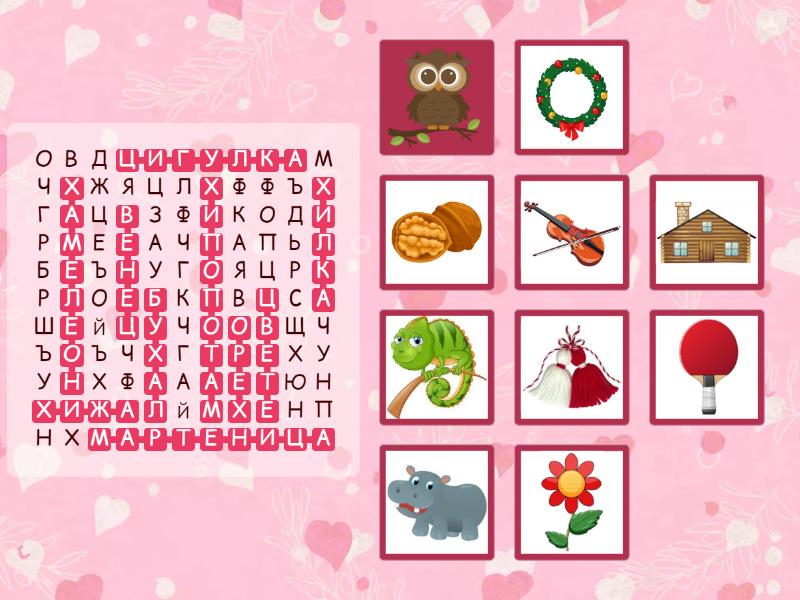 хамелеон, хипопотам, цигулка, цвете, орех, бухал, хижа, венец, хилка, мартеница,