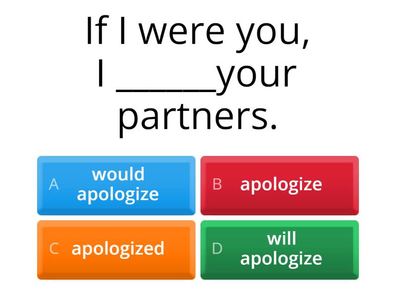 1) If I were you, I ______your partners. a) would apologize b) apologize c) apologized d) will apologize 2) Your library books are overdue. You ______if you return those books immediately. a) will not fine b) will not fined c) will not be fined d) will be not fine 3) If they build a five-star hotel there, the heritage population _______from view. a) will hide b) will be hidden c) is being hidden d) is hiding 4) ______ I stop eating so much chocolate, I am going to get fat. a) If b) Unless c) In case d) But for 5) I can’t decide what to do. What would you do if you ______ in my position? a) are b) have been c) will be d) were 6) You risk losing your job if your boss______ you weren’t really ill. a) will find out b) found that c) finds out d) founded 7) If she _______ to know more about it, she will need to spend more time. a) want b) wanted c) wants d) will want 8) I am sure that if we persuade them, they _______ their bad lifestyle. a) change b) changed c) will change d) would change 9) If you If I________money, I________a new uniform. a) have / will buy b) had / would buy c) had / will buy d) has / will buy 10) If she ____ the truth, I think she’d never want to see you again. a) would know b) knows c) will know d) knew 11) Do you think there would be less conflict in the world if all people ______ the same language? a) spoke b) don’t speak c) speak d) have spoken 12) What would you do if you __________ the lottery? a) win b) will win c) won d) have won 13) Were he ten years younger, he _____ part in the voyage around the world. a) would take b) took c) will take d) takes 14) When Mary _____ here tomorrow, I _____ you. a) came / will phone b) come / would phone c) come / will phone d) came / will have phoned 15) If Kamy ______ a haircut, she ______much better. a) gets / will look b) got / will look c) gets / look d) will get / looks
