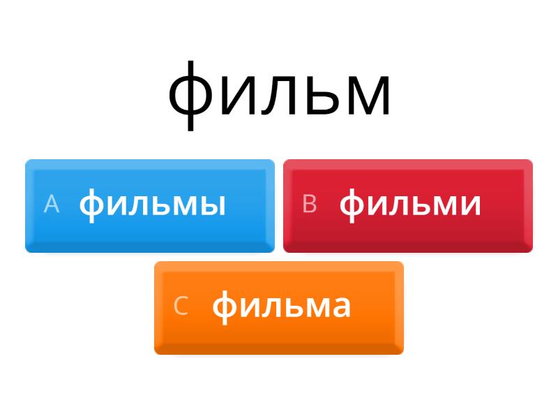 1) фильм a) фильмы b) фильми c) фильма 2) газета a) газети b) газеты c) газето 3) словарь a) словари b) словары c) словара 4) место a) месты b) мести c) места 5) музей a) музеи b) музеы c) музея 6) задание a) задании b) заданиы c) задания 7) человек a) люди b) человеки c) человекы 8) брат a) браты b) братьи c) братья 9) ребёнок a) ребёноки b) ребёнки c) дети 10) город a) городы b) города c) городи