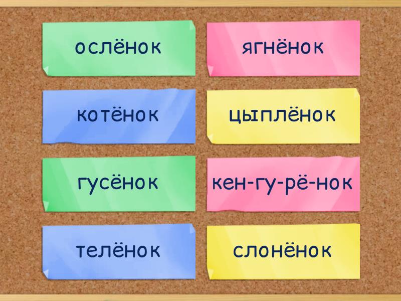 котёнок, ослёнок, телёнок, слонёнок, ягнёнок, цыплёнок, гусёнок, кен-гу-рё-нок,