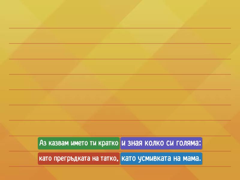 Аз казвам името ти кратко, и зная колко си голяма:, като прегръдката на татко,, като усмивката на мама..