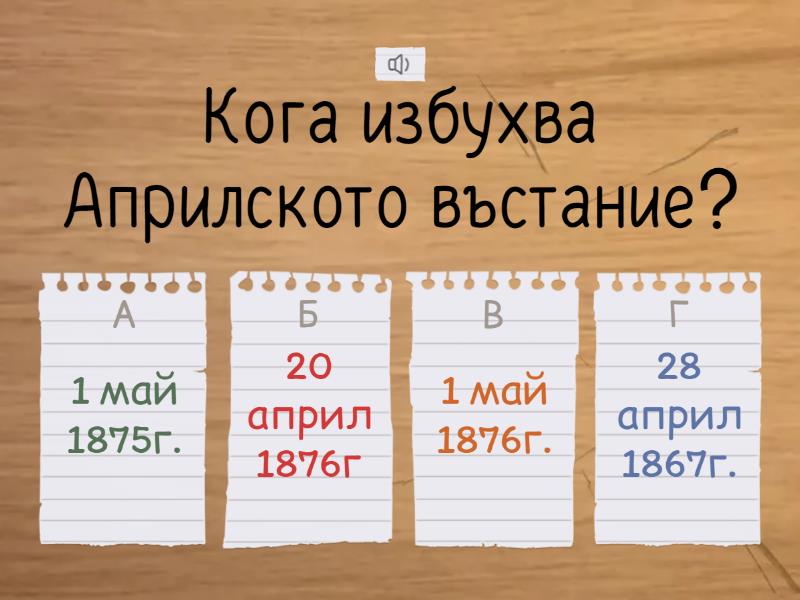 1) Кога избухва Априлското въстание? a) 1 май 1875г. b) 20 април 1876г c) 1 май 1876г. d) 28 април 1867г. 2) Къде се взема решение, че е време за въстание? a) Панагюрище b) Стрелча c) Гюргево d) Оборище 3) Първо в кой окръг избухва въстанието? a) Ⅱ Сливенски b) Ⅰ Търновски c) Ⅲ Врачански d) Ⅳ Пловдивски 4) Кой от апостолите изпраща " кървавото писмо"? a) Георги Бенковски b) Панайот Волов c) Тодор Каблешков d) Стоян Заимов 5) Кой ушива знамето на въстанието? a) Райна Кабаиванска b) Георги Бенковски c) Райна Попгеоргиева d) Тодор Каблешков 6) Кой виден революционер формира и оглавява „Хвърковата чета”? a) Георги Бенковски b) Панайот Хитов c) Стефан Стамболов d) Христо Ботев 7) Кой манастир е превърнат в своеобразна бойна крепост от четата на поп Харитон и Бачо Киро по време на въстанието? a) Троянски b) Бачковски c) Чипровски d) Дряновски 8) Особено запомнящ се момент от въстанието е появата на четата на Христо Ботев. На кой връх тя води тежко сражение срещу превъзхождащата я османска армия? a) Камарата b) Вола c) Мусала d) Ботев 9) В кой град избухва Априлското въстание на 20 април 1876 г.? a) Панагюрище b) Оборище c) Батак d) Копривщица 10) Как били наричани ръководителите на революционните окръзи по време на Априлското въстание? a) Губернатори b) Апостоли c) Полковници d) Генерали