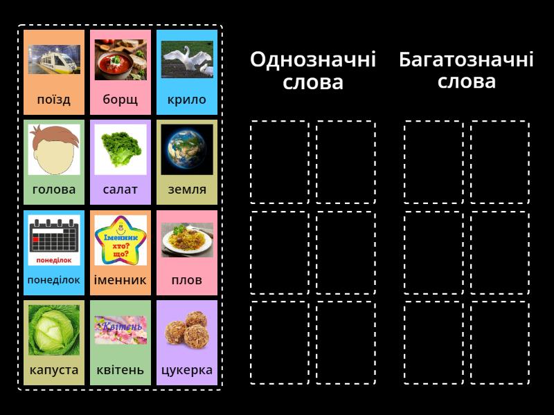 Однозначні слова: борщ, плов, іменник, квітень, понеділок, цукерка, Багатозначні слова: капуста, голова, земля, салат, поїзд, крило,