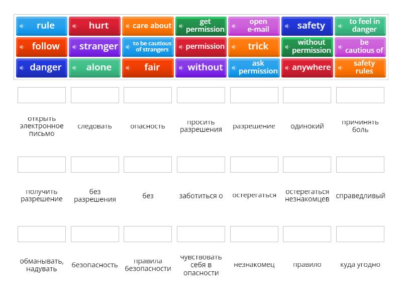 alone - одинокий, anywhere - куда угодно, care about - заботиться о, be cautious of - остерегаться, danger - опасность, rule - правило, follow - следовать, hurt - причинять боль, permission - разрешение, safety - безопасность, stranger - незнакомец, trick - обманывать, надувать, without - без, to feel in danger - чувствовать себя в опасности, safety rules - правила безопасности, get permission - получить разрешение, ask permission - просить разрешения, fair - справедливый, without permission - без разрешения, open e-mail - открыть электронное письмо, to be cautious of strangers - остерегаться незнакомцев,