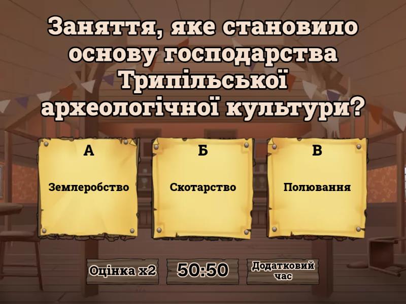 1) Заняття, яке становило основу господарства Трипільської археологічної культури? a) Землеробство b) Скотарство c) Полювання 2) Який метал використовували трипільці? a) Залізо b) Мідь c) Срібло 3) Як називають культуру кераміки трипільців a) Лінійно-стрічкова b) Гребінцева c) Мальована 4) Які матеріали використовували трипільці при будівництві своїх жител? a) Дерево, очерет, глина b) Дерево, камінь, солома c) Цегла, цемент, шифер 5) Який механізм застосовували трипільці для свердління кременю? a) Ручний дриль b) Ручне рубило c) Мережевий дриль 6) Першовідкривач Трипільської археологічної культури? a) Аркадій Добровольський b) Борис Мозолевський c) Вікентій Хвойка