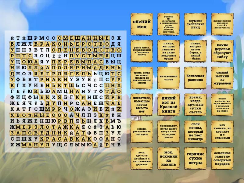 Арктика - район Земли, примыкающий к Северному полюсу, Полярная ночь - время, когда несколько месяцев не показывается солнце, Полярный день - время, когда круглые сутки светло, Птичий базар - шумное скопление птиц, Морж - как тюлень, но крупнее и с клыками, Лишайник - мох, похожий на накипь, Тюлень - животное, имеющее ласты вместо ног, Браконьерство - незаконная охота, Заповедник - участок, где оберегаются и размножаются редкие и ценные растения, животные., Тундра - безлесная равнина, Мерзлота - слой почвы, который не тает никогда, Ягель - олений мох, Куропатка - птица, которая летом бурая, а зимой - белая, Оленеводство - основное занятие северных народов, Хвойные - какие деревья образуют тайгу, Кедровка - птица, которая запасает на зиму кедровые орехи, Бурундук - похож на белку, но вдвое меньше, с черными полосками на спине, Смешанные - леса, где есть хвойные и лиственные деревья, Суховеи - горячие сухие ветры, Красавка - самый мелкий из журавлей, Манул - дикий кот из Красной книги, Перевыпас - происходит, когда долго пасут скот на одном месте, Пустыня - земля, раскаленная солнцем, Сайгак - парнокопытное животное степей и полупустынь,
