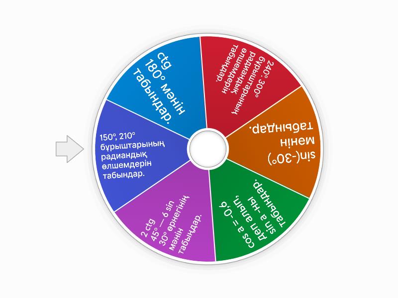 1) ctg 180° мәнін табындар. 2) 240°. 300° бұрыштарының радиандық өлшемдерін табыңдар. 3) sin(-30°) мәнін табындар. 4) cos a = -0,6 деп алып, sin a -ны табындар. 5) 2 ctg 45° — 6 sin 30° өрнегінің мәнін табыңдар. 6) 150°, 210° бұрыштарының радиандық өлшемдерін табындар.