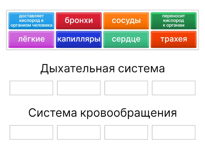 Дыхательная система: лёгкие, трахея, бронхи, доставляет кислород в организм человека, Система кровообращения: сосуды, сердце , капилляры , переносит кислород к органам,